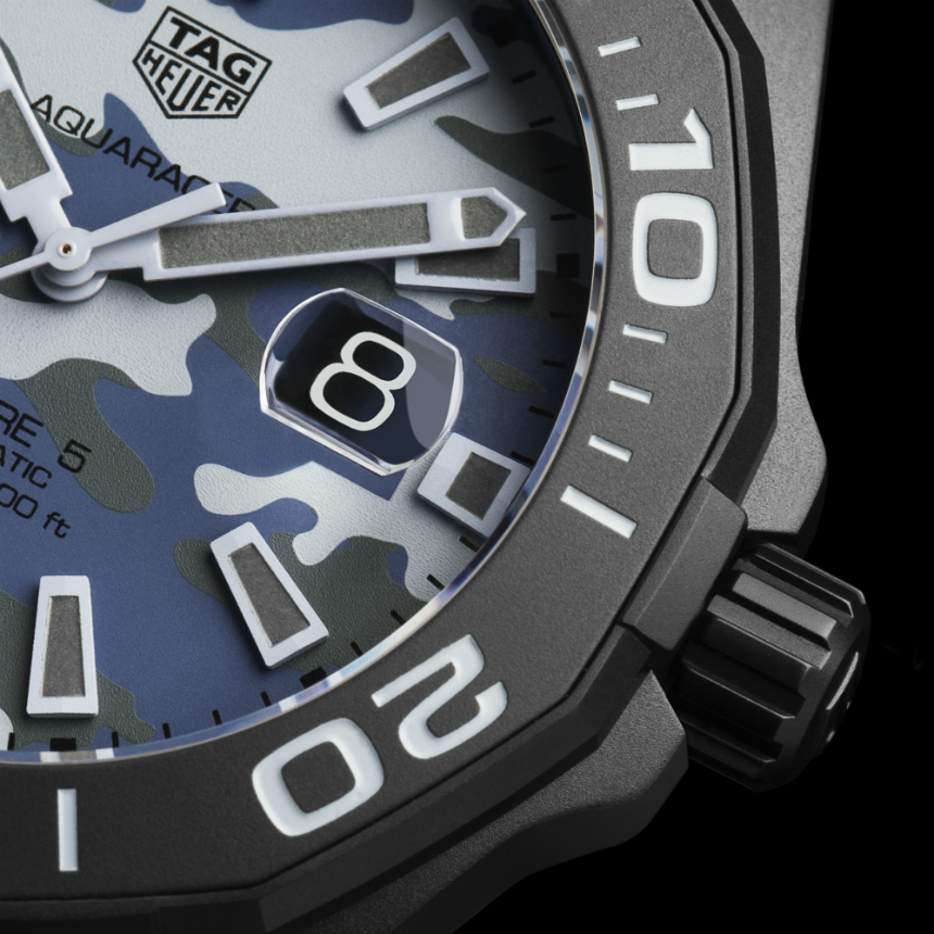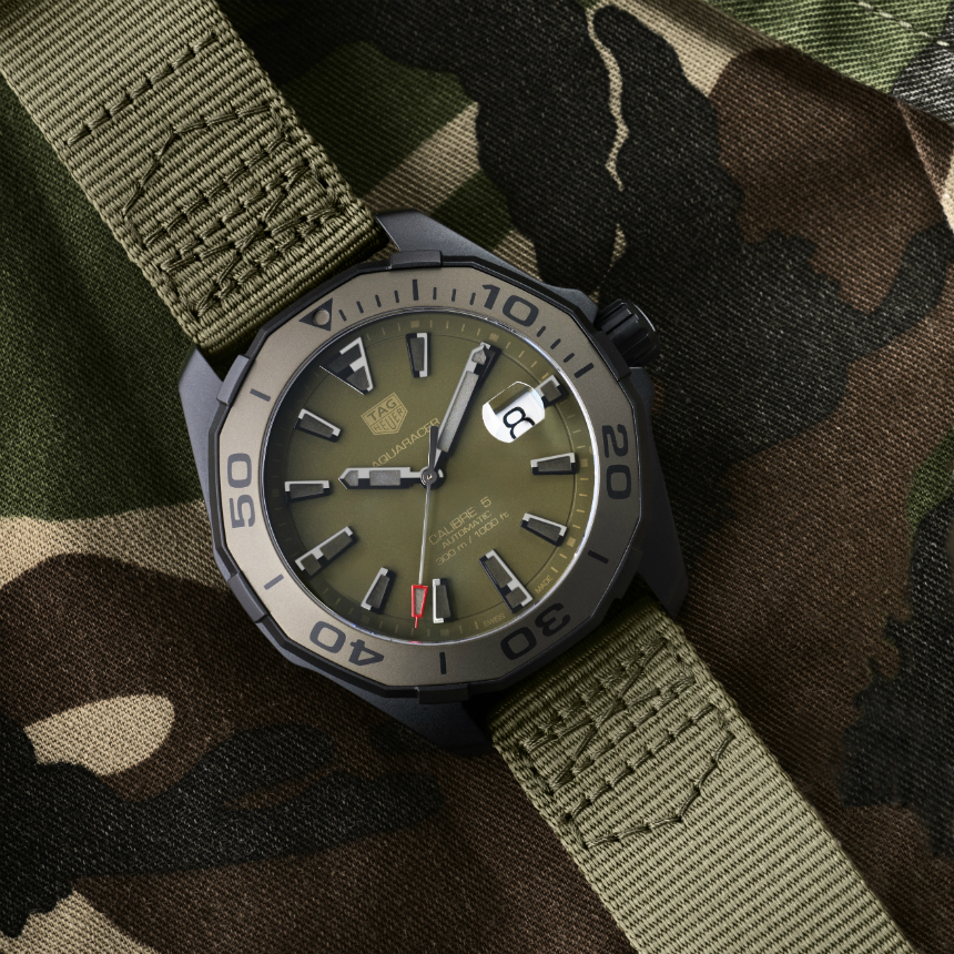 Here's the thing with camouflage: it is, by definition, a means of disruption which uses a sharply contrasting pattern to break up the physical outlines of whatever it is it's trying to obscure. So it should come as little surprise that TAG Heuer - the brand who has probably invested more time and energy disrupting their own status quo than any other Swiss watchmaker - is pushing the camouflage slider all the way to eleven on a pair of military-inspired TAG Heuer Aquaracer 300 Caliber 5 watches replicas WAY208E.FC8222 with khaki dial, ref. WAY208D.FC8221 in arctic camo.
